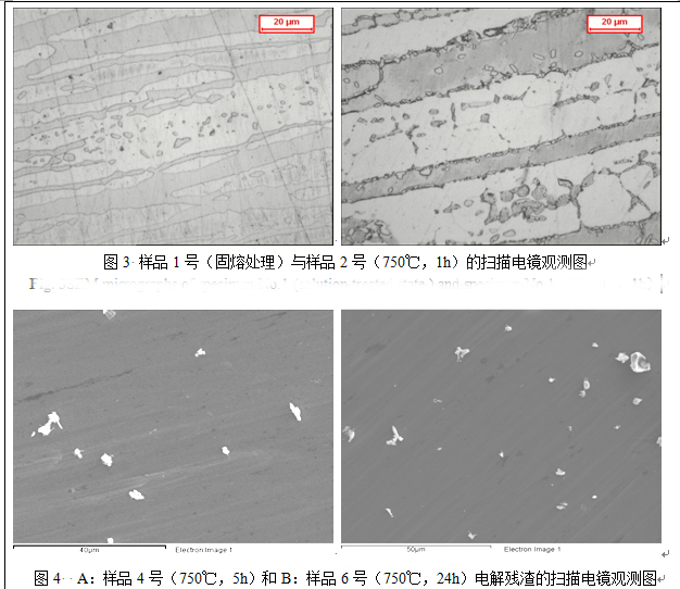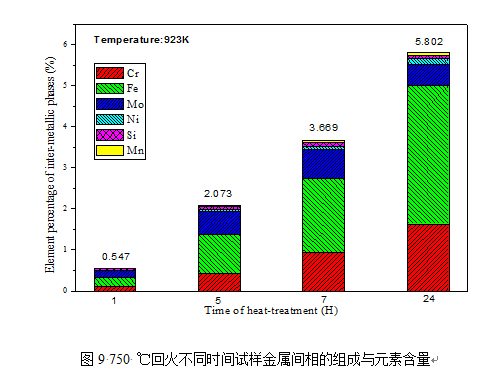 (4)實驗考查了750 ℃回火不同時間試樣的不同析出相的組成與元素含量,從中可以看到,隨著回火時間的延長,金屬間相的含量呈明顯上升的趨勢,從1H時的0.547 %上升到24H的5.802 %。在時效開始時先形成金屬間相χ相,而隨著時間的延長,σ相逐漸形成并最終占主量。