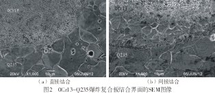 利用掃描電子顯微鏡對爆炸不銹鋼復合板的結合界面進行了觀察,發現不銹鋼與碳鋼之間存在兩種結合方式,一種是直接結合(如圖2a所示), 另一種是間接結合(如圖2b所示)。間接結合方式中的中間層是由于基板和復板中的合金元素互溶形成的,該區域的化學成分介于復板和基板之間[5]。因為經歷了金屬熔化和凝固階段,熔合層易出現氣孔、裂紋等缺陷,成為界面結合較薄弱的區域。從圖2中還可以發現,不管是以何種方式結合,界面附近都有超細晶粒帶出現。這是在爆炸過程中由于材料的高速碰撞,在極短的時間內產生巨大的壓力使該處金屬受到很大的剪切作用,塑性剪切功轉變的巨大熱量使金屬在很窄的區域內發生熔化,之后又急劇冷卻,故形成極細的組織,甚至有非晶組織形成[6]。